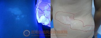 1、伍德灯:腹部白癜风色素脱失,边缘模糊不清,处于发展期