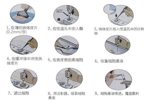 3、采用融合细胞“上喷”技术,1*1平方厘米供体皮片获得的上皮细胞悬液可覆盖80平方厘米创面。供体皮肤组织仅需要提供2cm*2cm,可实现较大面积320平方厘米的白癜风治疗;